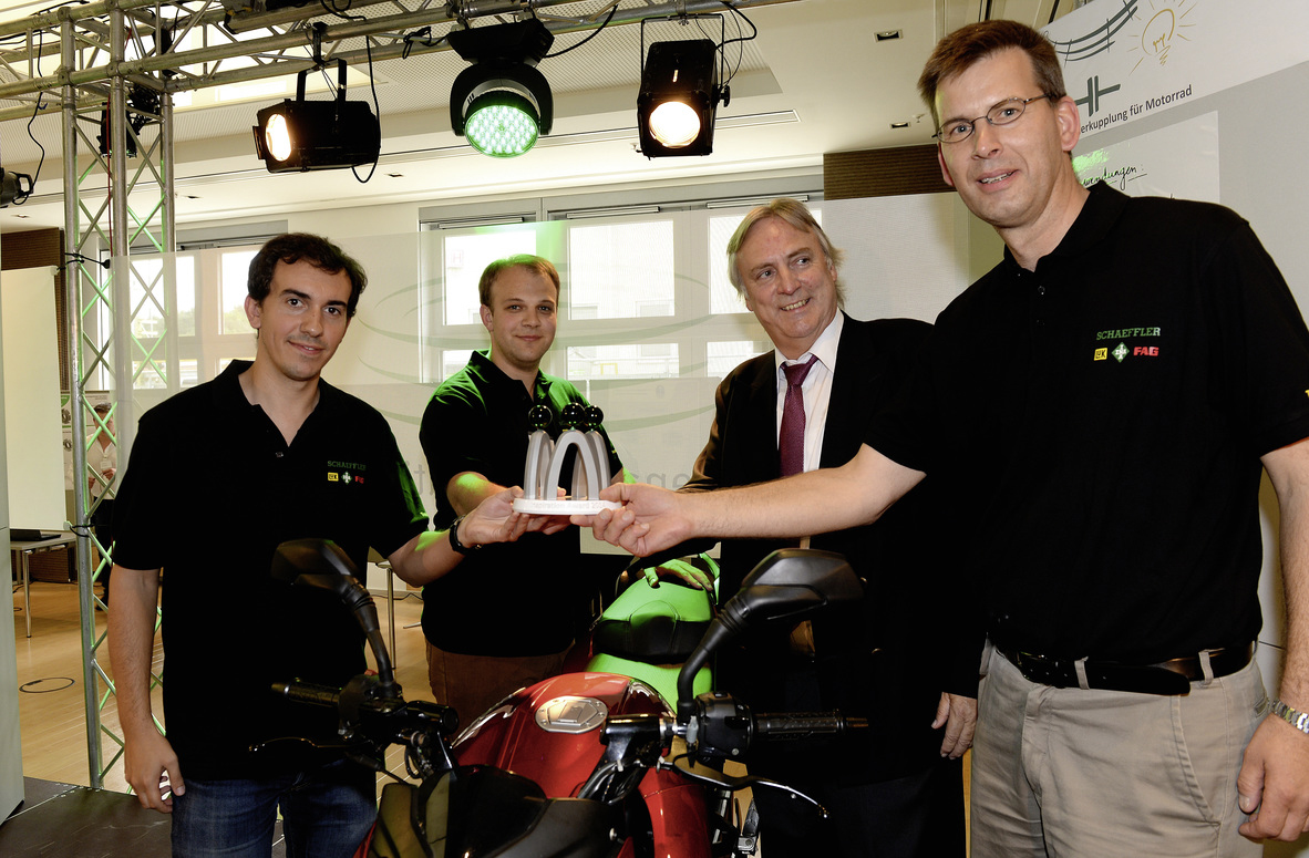 從左至右:來自布爾的馬丁查姆布倫(MartinChambrion)和詹斯蘭格齊(JensLanganki)憑借關(guān)于摩托車新離合器的創(chuàng)意獲得了今年的靈感大獎(jiǎng)。舍弗勒集團(tuán)副首席執(zhí)行官兼首席技術(shù)官彼得古茲默教授和離合器壓盤產(chǎn)品開發(fā)總監(jiān)克里斯托弗惠特曼為其頒獎(jiǎng)。